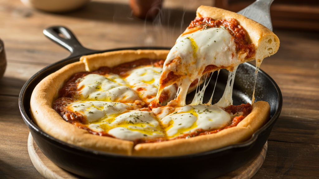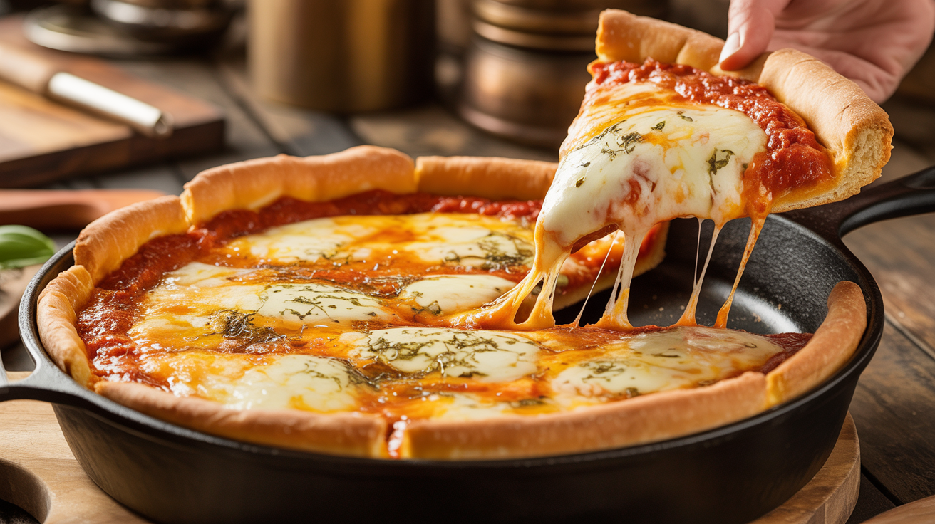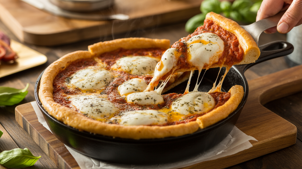 If you’ve been dreaming of a pizza that’s thick, indulgent, crispy on the outside, soft on the inside, loaded with cheese, layered with rich sauce, and baked to golden perfection… this deep dish cast iron pizza recipe is exactly what you need.