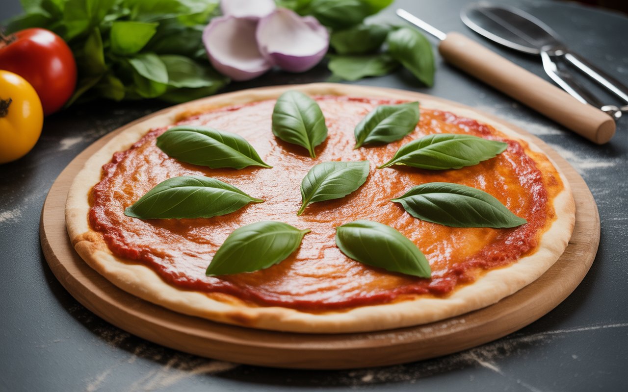 Place the shaped dough on parchment or a floured pizza peel. Top with a thin layer of tomato sauceâdonât drown it! Scatter torn mozzarella and a few basil leaves.