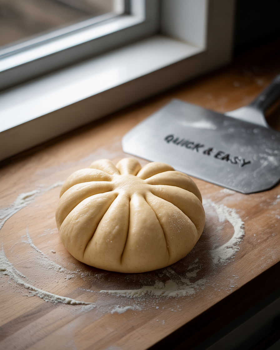 Turn the dough out onto a lightly floured surface. Knead for about 5–7 minutes until it becomes smooth, elastic, and slightly tacky. This quick knead is enough to build gluten without requiring rising time.