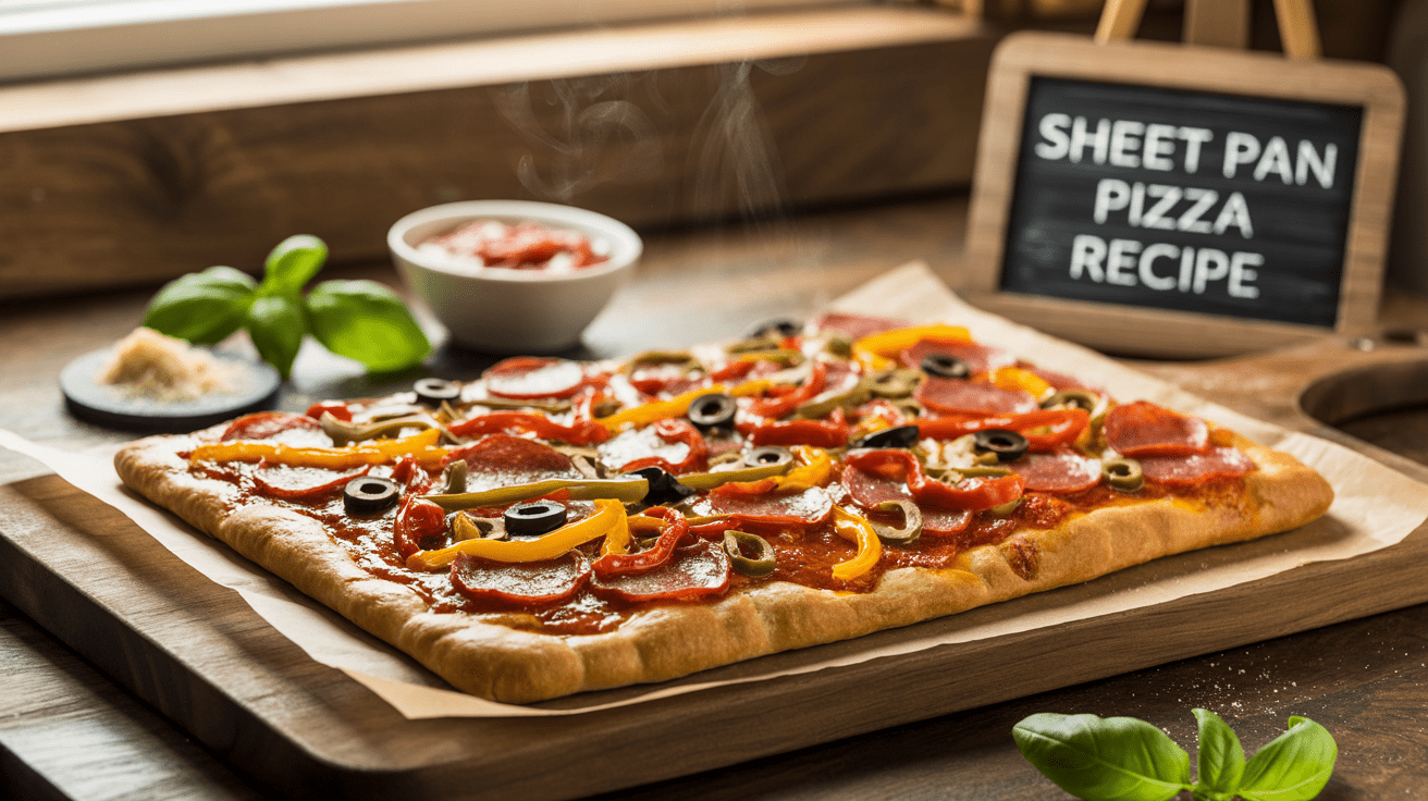 There’s something almost nostalgic about a sheet pan pizza recipe. Maybe it’s because it reminds us of Friday nights as kids, the smell of bubbling cheese filling the kitchen, or the excitement of sharing big square slices at a family gathering. Unlike a classic round Neapolitan pie, sheet pan pizza is hearty, rustic, and made for feeding a crowd. It’s not fussy — it’s bold, cheesy, saucy, and baked to perfection in your oven.